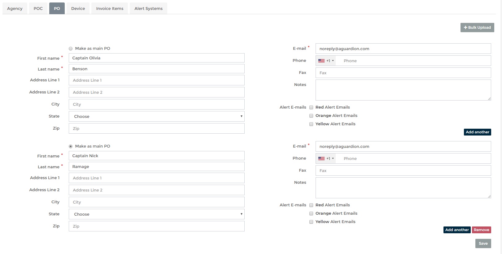 select a ‘Main PO’ for reporting purposes. Enable alert emails if you want PO's to receive them.