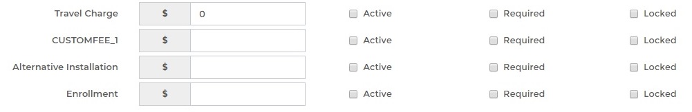 You can learn more about them on the Custom Fee knowledge base page. Just like Install Fee's, they appear during an installation. 'Active' will display the Custom Fee in question during installs being created under the Agency in question. 'Required' will prevent an installer from proceeding without taking the Custom Fee- the installer will still be able to alter the amount. 'Locked' will prevent the installer from altering the amount.