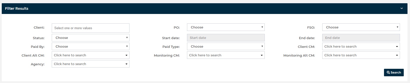 The Aguardion system utilizes a ‘filter results’ feature throughout the system to assist users in quickly finding the information they need. Using the drop-down menus, select as many filters as you’d like and then select ‘search’ to sort by your filters.